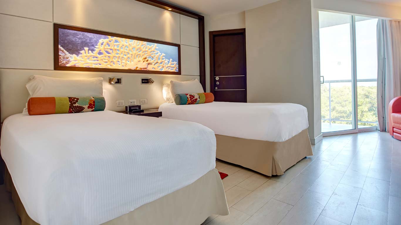 The Luxury Rooms at Royalton White Sands Resort with 1 King Bed or 2 Twin Beds or 1 Full and 1 Twin Bed, comfortable Double Sofa Bed, brightly decorated rooms with garden view or mountain view from the balcony or terrace.