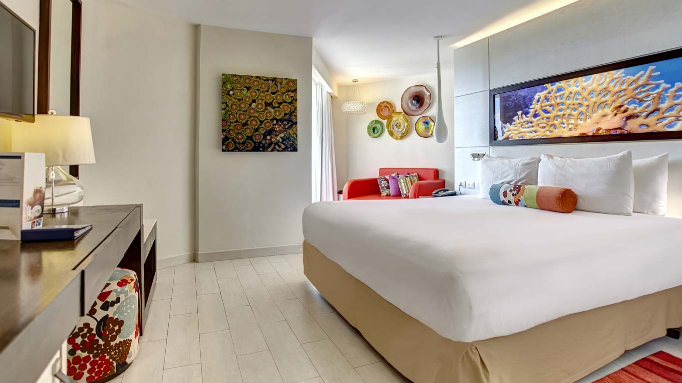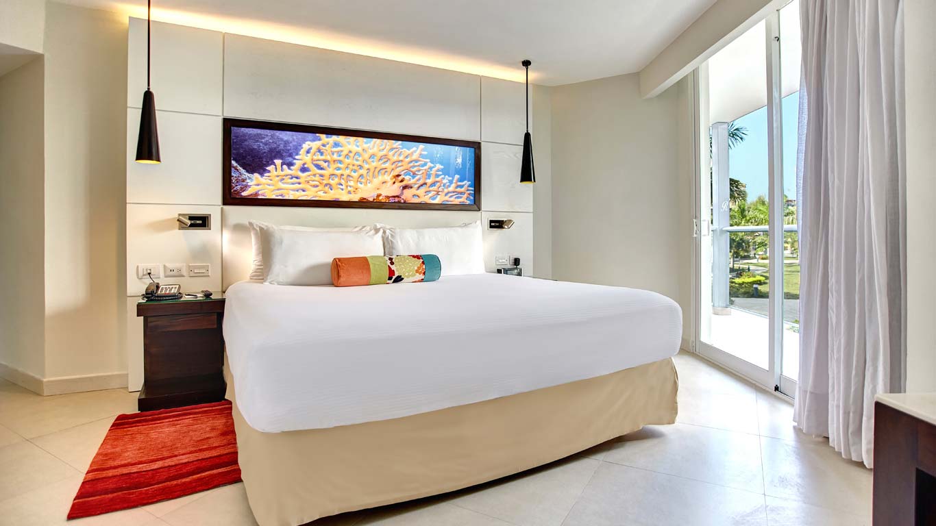 The Luxury Ocean View Rooms at Royalton White Sands Resort feature 1 King Bed, 2 Twin Beds or 1 Full and 1 Twin Bed, comfortable Double Sofa Bed, brightly decorated room overlooking the ocean from the balcony or terrace.